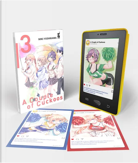 In allegato 3 illustration card e un portacartoline esclusivo progettato per raccogliere anche le 3 illustration card contenute in "A couple of cuckoos early premiere". Nagi Umino, diligente studente liceale, vede la sua tranquilla quotidianità messa sottosopra quando scopre di essere stato vittima di uno scambio di culle, e che pertanto quelli che l'hanno cresciuto non sono realmente i suoi veri genitori. Ma qui le cose si fanno più complicate: lo stesso giorno in cui ha preso appuntamento per incontrare la sua famiglia biologica, conosce casualmente la superstar dei social Erika Amano, e accetta di fingersi il suo fidanzato per salvarla da un matrimonio combinato – nonostante sia in realtà innamorato della brillante compagna di classe Hiro. Ma quando finalmente incontra i genitori mai conosciuti, le cose si fanno ancor più complicate: Erika altri non è se non l'altra vittima dello scambio di culle, figlia biologica dei suoi genitori adottivi! E il suo promesso sposo altri non è che... Nella casa in cui convivono Nagi ed Erika, arriva anche la sorellina Sachi. Nagi cerca di convincerla a tornare dai genitori e tra di loro scoppia una grossa lite, ma in realtà Sachi non è riuscita a dirgli che vuole solo passare un po' più di tempo insieme a lui. Dopo l'appuntamento al parco divertimenti con Hiro, la ragazza di cui Nagi è innamorato, sembra che anche con Erika le cose stiano rapidamente cambiando. Cosa succederà a questo quadrangolo amoroso che ogni giorno si fa sempre più complicato?